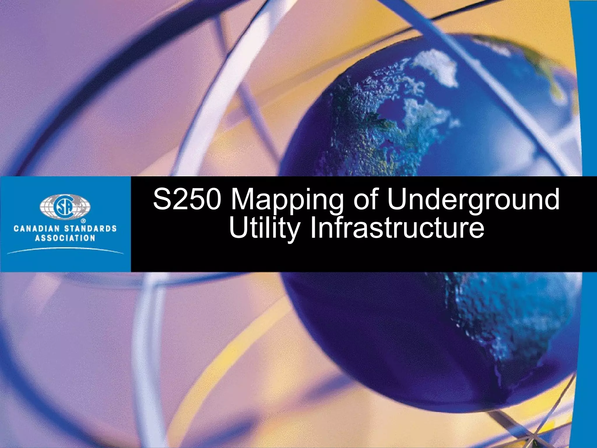 The document outlines a communication strategy to introduce and gain support for the CSA S250 standard for mapping underground utility infrastructure. The strategy's key messages are that developing this standard was a logical step to better manage locating buried utilities, and that independent mapping efforts were progressing without coordination. The strategy identifies target audiences like utility owners and regulators, and delivery tactics including presentations at conferences and on websites, to communicate the standard's development process, scope, and status.