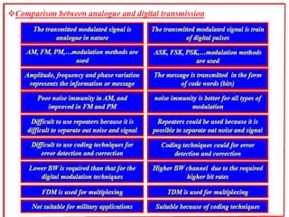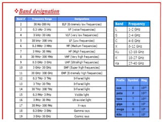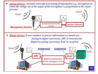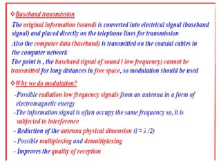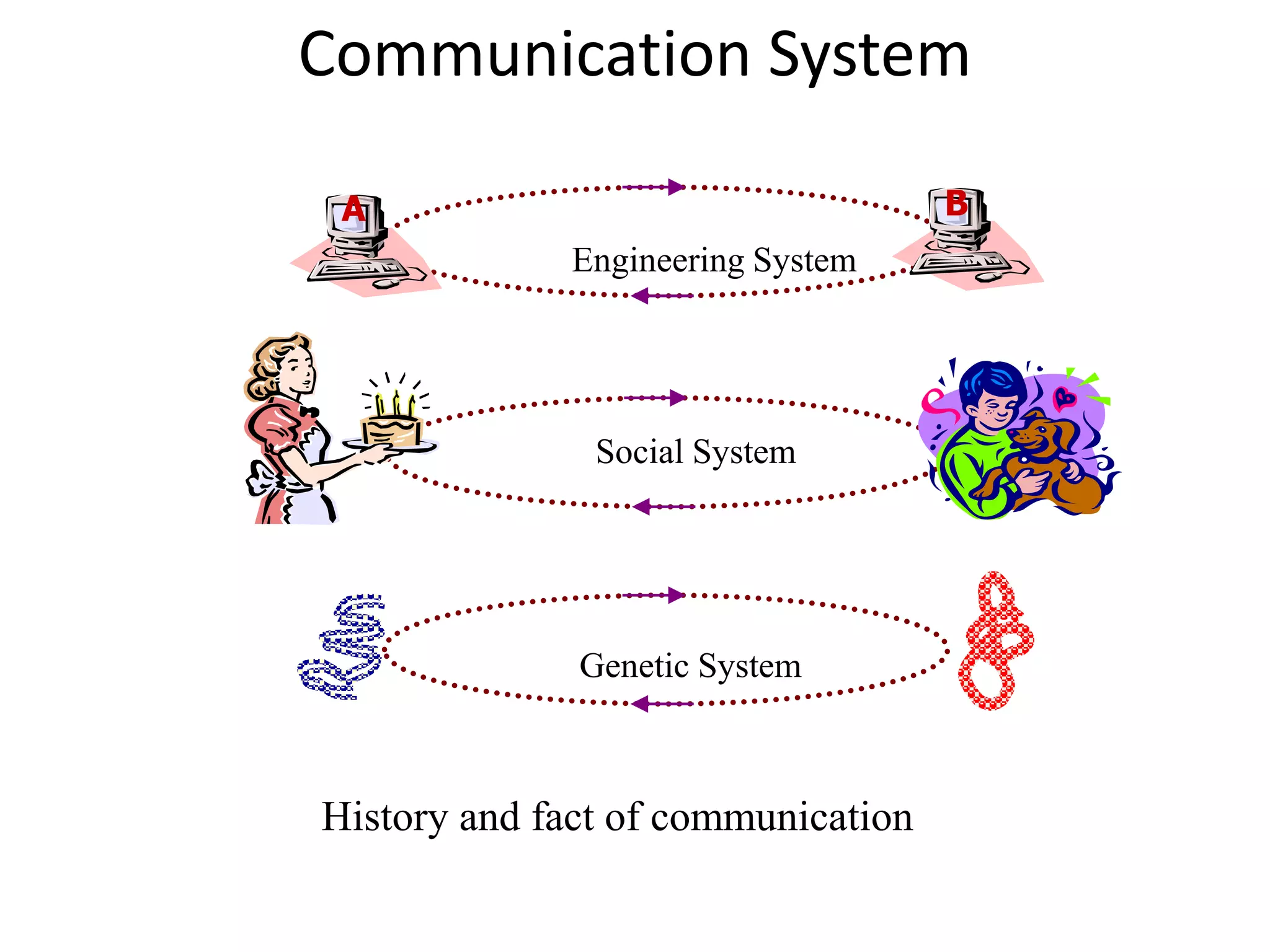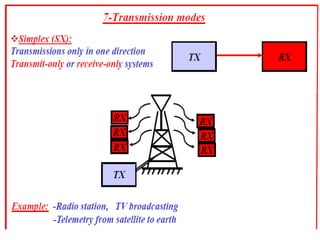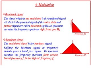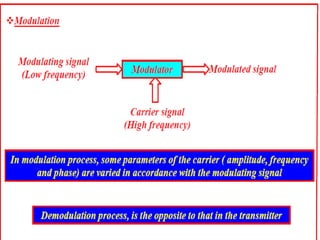 A communications system allows for the transfer of information from an information source to an information sink. It consists of a transmitter that encodes a message from the information source into a transmitted signal, a channel to carry the signal, and a receiver to decode the signal back into a message for the information sink.