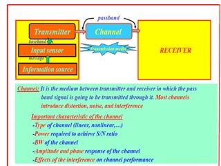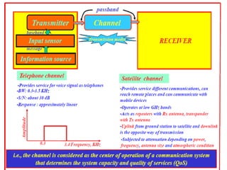 The transmitter may perform operations like modulation, amplification, and filtering on the message signal. The channel can be a wireline medium like coaxial cable or a wireless medium like free space. It is subject to degradation from noise, interference and distortion. The receiver performs complementary operations to the transmitter like demodulation, amplification and filtering to recover the original message from the received signal for the information sink.