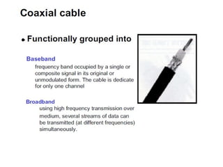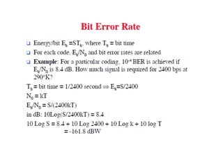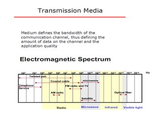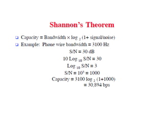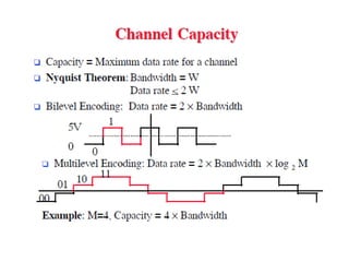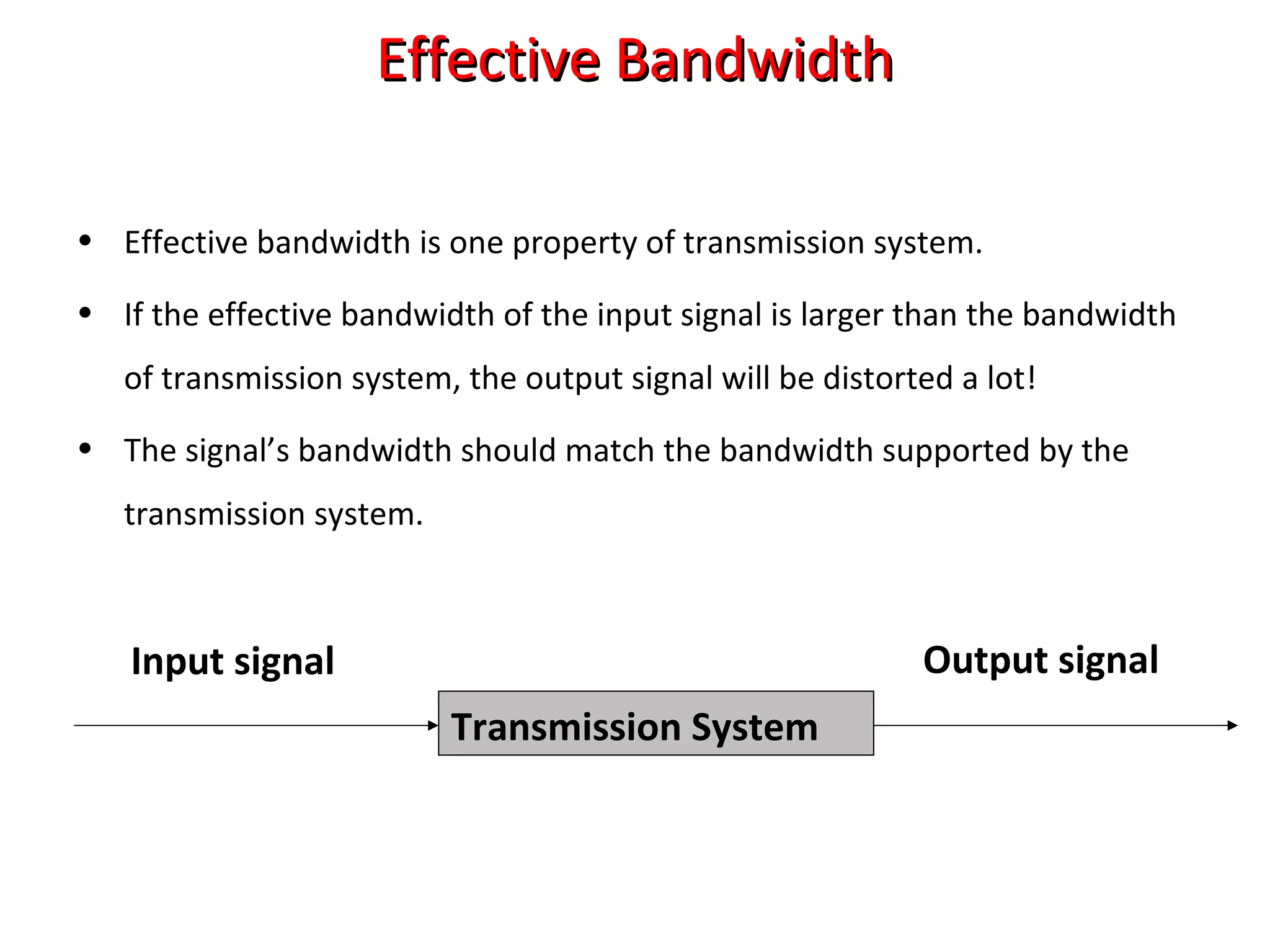 Effective bandwidth refers to the bandwidth of an input signal that can be transmitted without distortion through a system. If the input signal bandwidth is larger than the system bandwidth, the output will be distorted. The signal and system bandwidths should match. Transmission impairments like attenuation, delay distortion, and noise can distort signals and introduce errors. Different types of cables like twisted pair, coaxial, and optical fiber have different characteristics for digital data transmission.