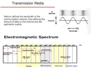 This document provides information about optical fibers, including their core components, types, transmission characteristics, and applications. It discusses the basic structure of an optical fiber, which consists of a glass core surrounded by a cladding layer and protective coating. The document outlines the three main types of optical fibers - step-index multimode, graded-index multimode, and single mode - and their uses in different communication systems. It also covers optical fiber transmission windows, loss calculations, and system components.