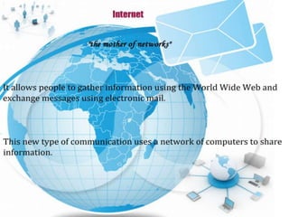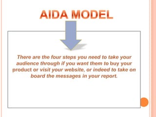 The document discusses communication technology and the AIDA model of communication. It begins by defining communication and describing different types of communication technology, including graphic, wave, and electronic technology. It then explains the AIDA model, which states that effective communication moves individuals through the stages of attention, interest, desire, and action. The document provides examples of how to apply the AIDA model in marketing communications to attract attention, build interest, create desire, and encourage action.