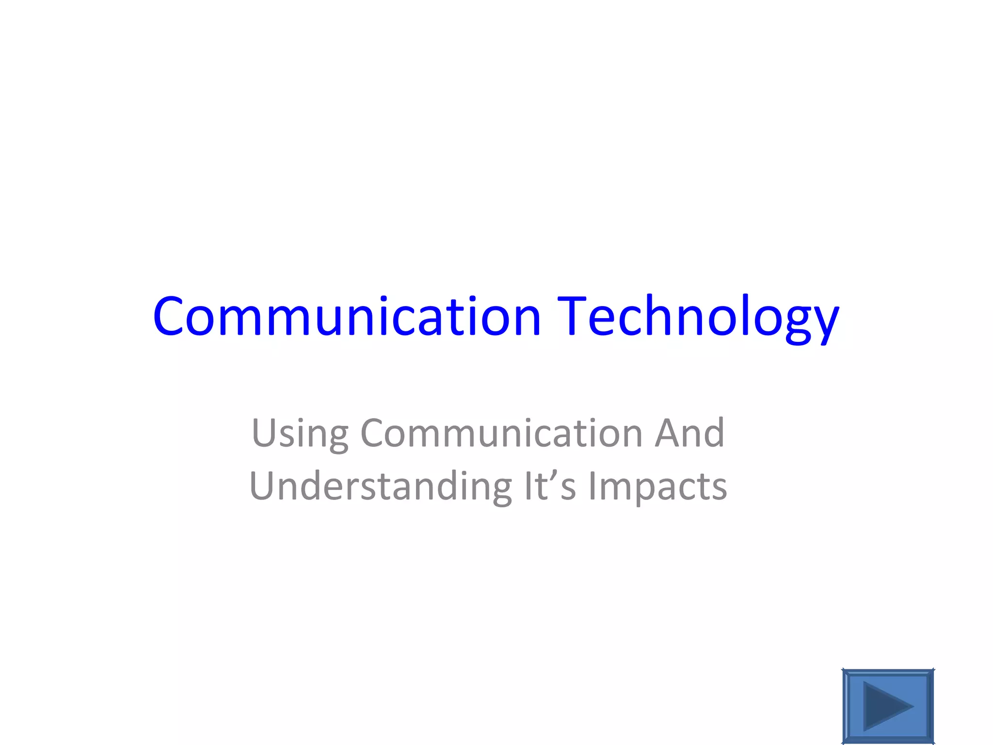 This document analyzes the history and impacts of various communication technologies, including cell phones, MP3 players, the Internet, computers, television, radio, digital cameras, and digital video cameras. It discusses how each technology works and lists both appropriate and inappropriate ways people use each form of communication. The objectives are to analyze the history of communication, communication technologies, and the impacts of technological communication. Resources for further information are provided.