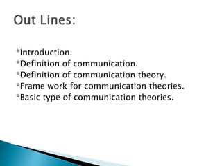 - Mechanistic, psychological, social, and systemic theories of communication.