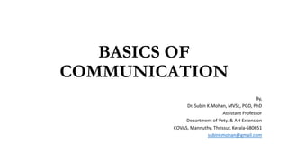 This document provides an overview of the basics of communication. It defines communication as the process of sharing information, ideas, thoughts, and feelings from a source to a receiver through various mediums to develop a common understanding. The document discusses models of communication, types of verbal and nonverbal communication, levels of communication from intrapersonal to mass communication. It also outlines various barriers to effective communication such as environmental, semantic, cultural, psychological, perception, organizational, gender differences, and choosing the wrong communication medium. The document serves to introduce fundamental concepts about the nature and process of communication.