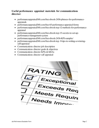 The document is a comprehensive job performance evaluation form for a Communications Director, detailing various performance factors and rating definitions such as outstanding, meets expectations, below expectations, and unsatisfactory. It includes a variety of performance appraisal methods, positive and negative review phrases, and guidelines for action plans based on performance outcomes. Additionally, it emphasizes the importance of effective communication, teamwork, decision-making, and creativity within the evaluation process.