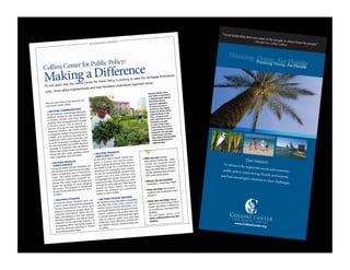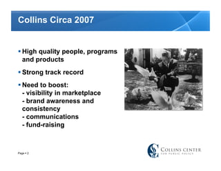 The document summarizes the creation of a communications, marketing and development division called Collins Central at the Collins Center. It describes hiring staff to support the needs of the Collins Center programs through communications, marketing, development and web support. It provides an overview of the departments and some of their key projects, including producing reports, newsletters and explaining state amendments to voters. It concludes with a case study of their marketing efforts for the 2010 Florida amendments which increased website traffic and engagement.