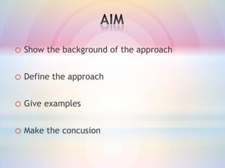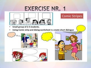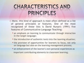 The document discusses the communicative approach to language teaching. It originated in the late 1960s in response to the need to focus on communicative proficiency over mechanical practice. The communicative approach emphasizes using language in meaningful, authentic contexts through activities like group work. It aims to develop students' communicative competence, including their ability to interpret, express, and negotiate meaning. Examples show students practicing topics in small groups to engage in real communication rather than just repetition of patterns. The approach has advantages like acquiring language through use, but also disadvantages if students are not sufficiently challenged.