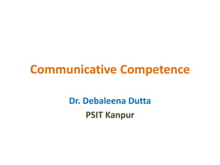 Dr. Debaleena Dutta discusses communicative competence, which is the ability to communicate effectively and appropriately according to the social context. Communicative competence has four components: linguistic competence involving grammar, vocabulary, and pronunciation; discourse competence involving organizing sentences coherently; socio-linguistic competence involving adapting language style to different audiences; and strategic competence involving resolving communication breakdowns. Successful communication requires both theoretical linguistic knowledge and practical application of language according to the social situation.