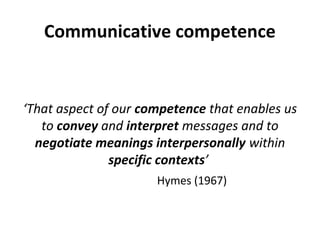 Communicative competence refers to the ability to convey and interpret messages within social contexts. It includes pragmatic competence, or knowledge of how to use language appropriately in different social situations. A document discusses the components of communicative competence, which include linguistic, discourse, strategic, sociolinguistic, and sociocultural competence. It also discusses communicative language teaching and task-based instruction, which focus on developing learners' real-world communication abilities.