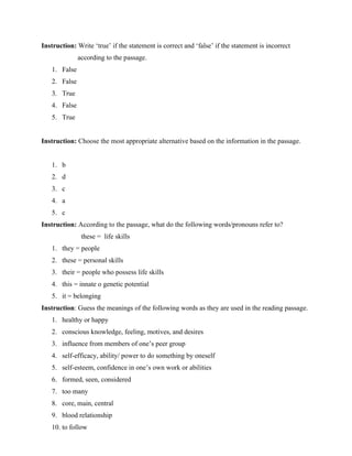 The document provides a summary of key activities and exercises from an English language skills textbook. It includes 4 units that cover topics like life skills, speculation about the future of science, environmental protection, and indigenous knowledge. For each unit, there are reading comprehension questions, grammar exercises, and other language activities. The summary focuses on providing a high-level overview: