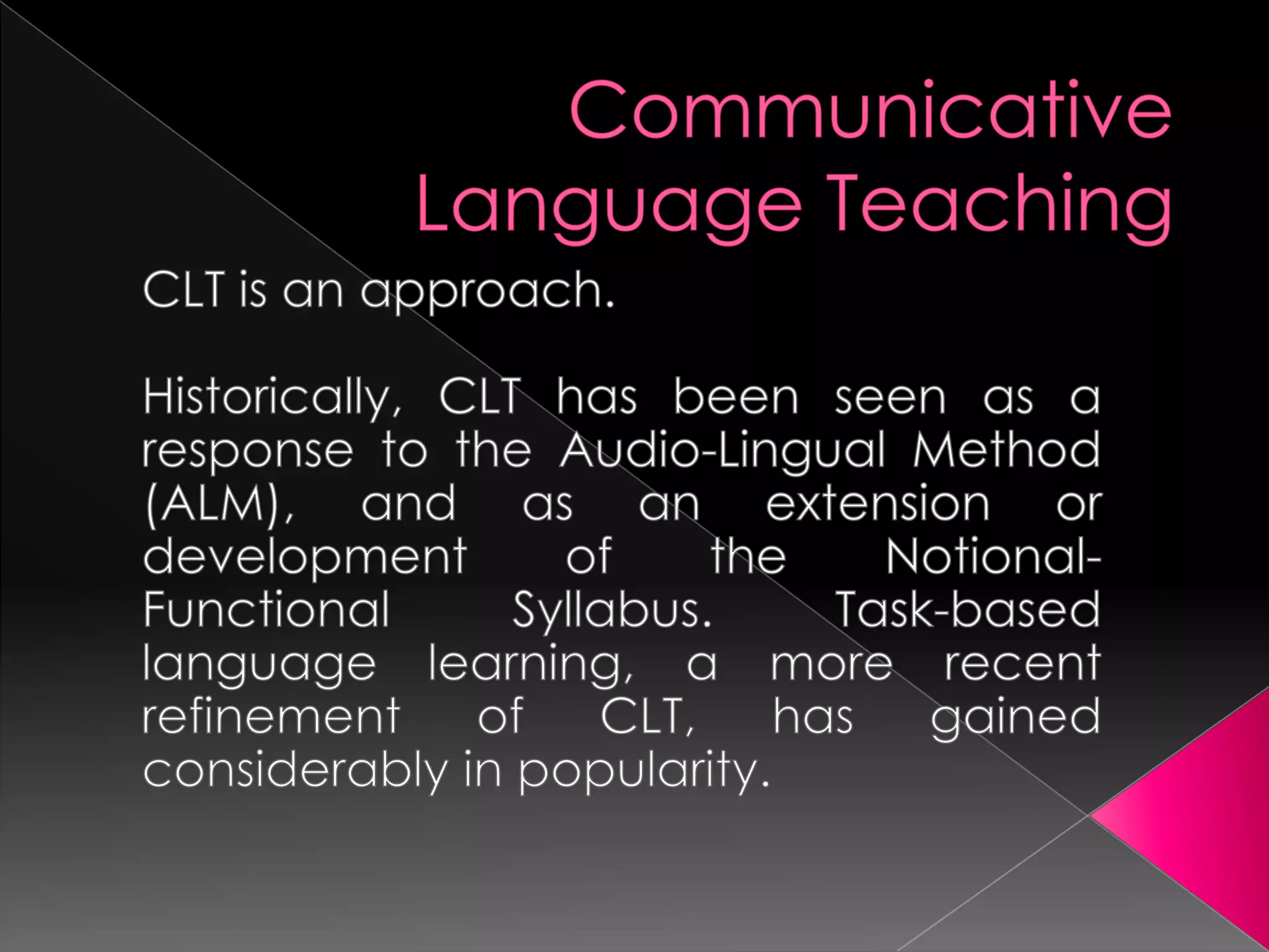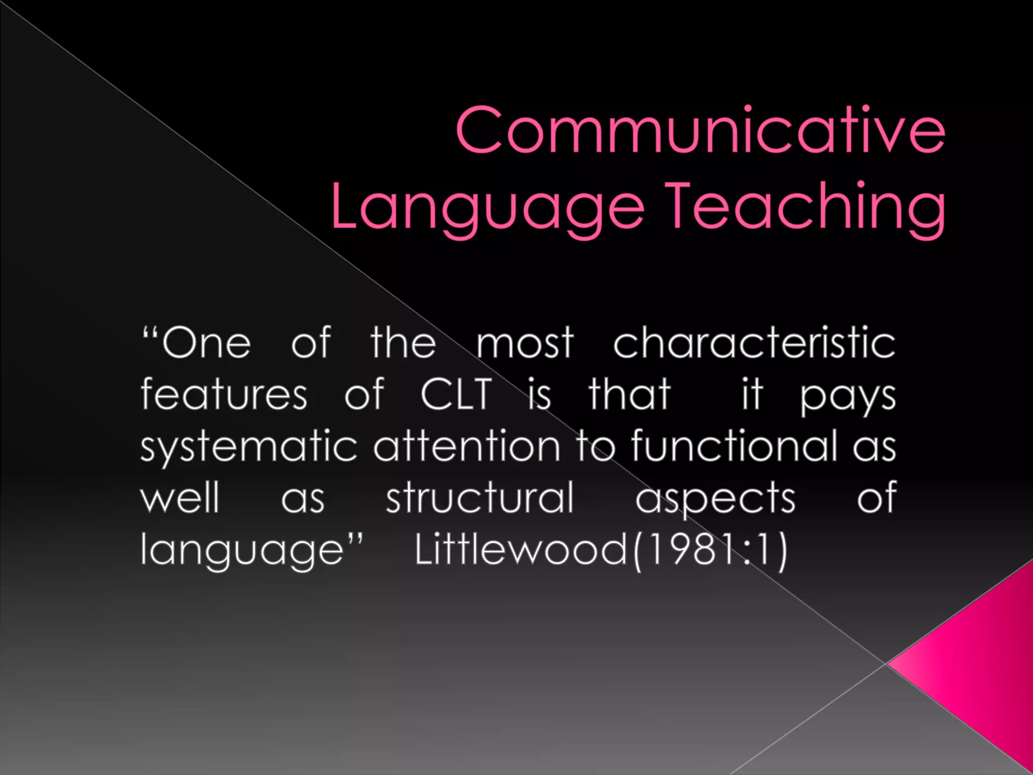 This document describes a classroom activity using the communicative language teaching (CLT) method with a 5th grade class. The teacher presents grammar and vocabulary, then has students conduct a survey by asking each other questions in pairs. The goal is for students to practice speaking skills while learning about each other. Key principles of CLT used include focus on communication, learner-centered approach, and experience-based learning through interaction and trial/error. Potential challenges of CLT discussed include lack of clear grammar rules and need for teacher training to implement the method effectively.
