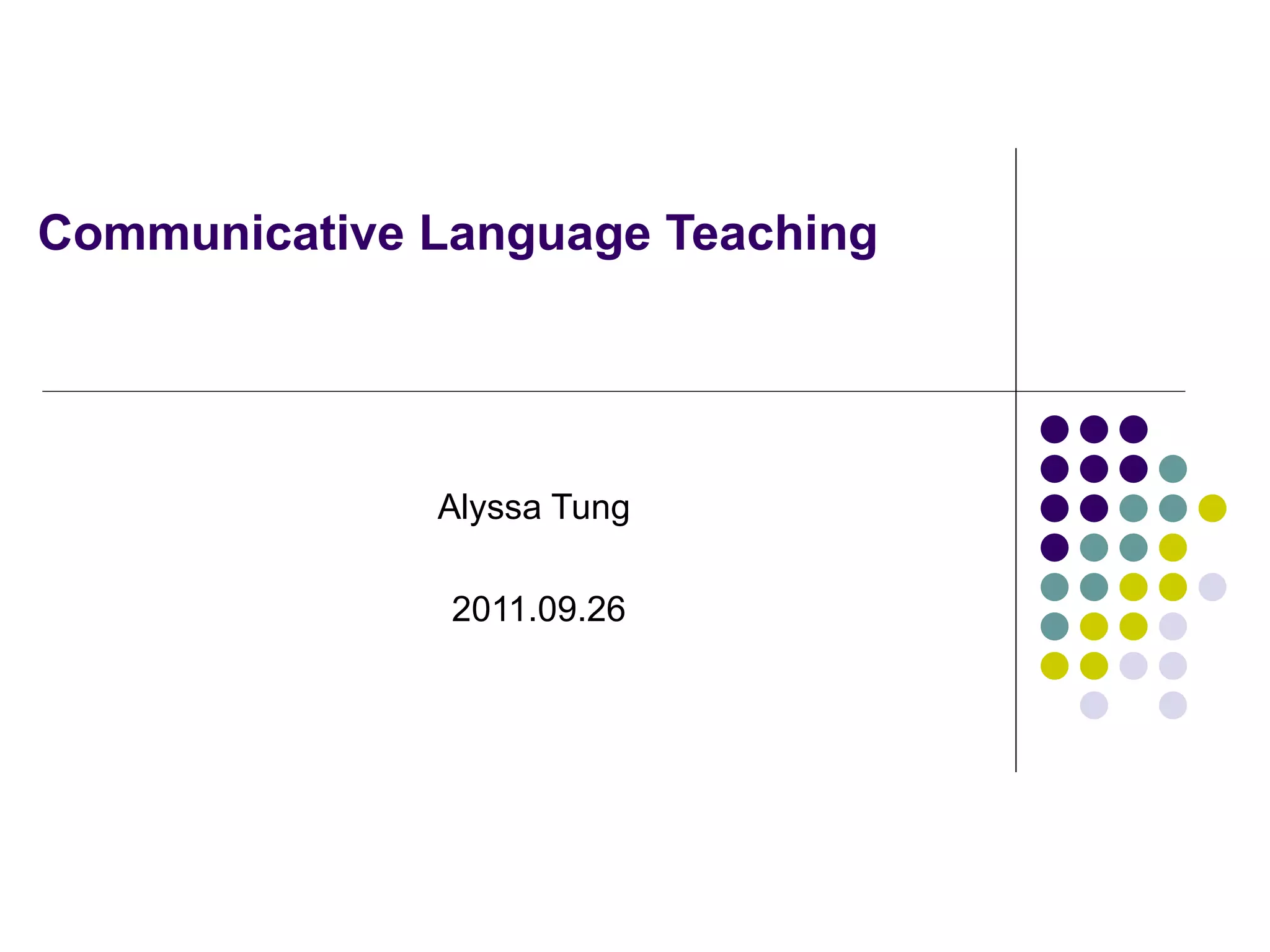 本文介绍了交际语言教学法的核心理念,强调意义和功能性对话的重要性。学习语言被视为学习沟通,鼓励学生积极互动并使用母语或翻译作为辅助。教师的角色是激励学生,提高其学习动机,并关注语言的流畅性和可接受性。