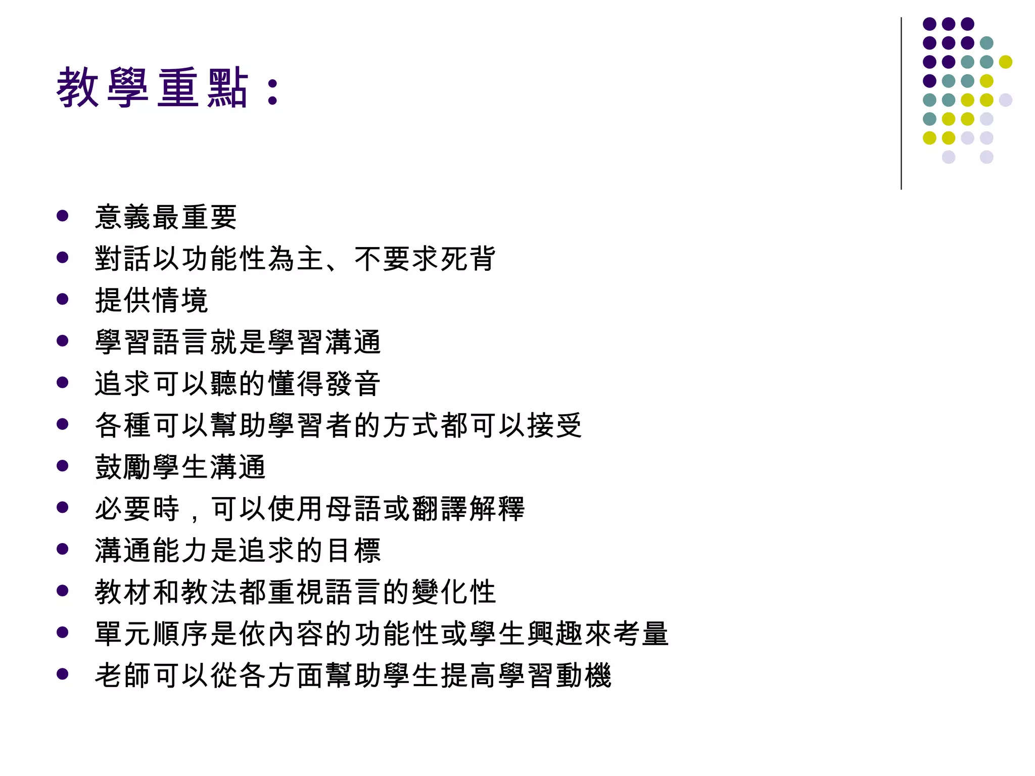 對話以功能性為主、不要求死背 提供情境 學習語言就是學習溝通 追求可以聽的懂得發音 各種可以幫助學習者的方式都可以接受 鼓勵學生溝通 必要時,可以使用母語或翻譯解釋 溝通能力是追求的目標 教材和教法都重視語言的變化性 單元順序是依內容的功能性或學生興趣來考量 老師可以從各方面幫助學生提高學習動機