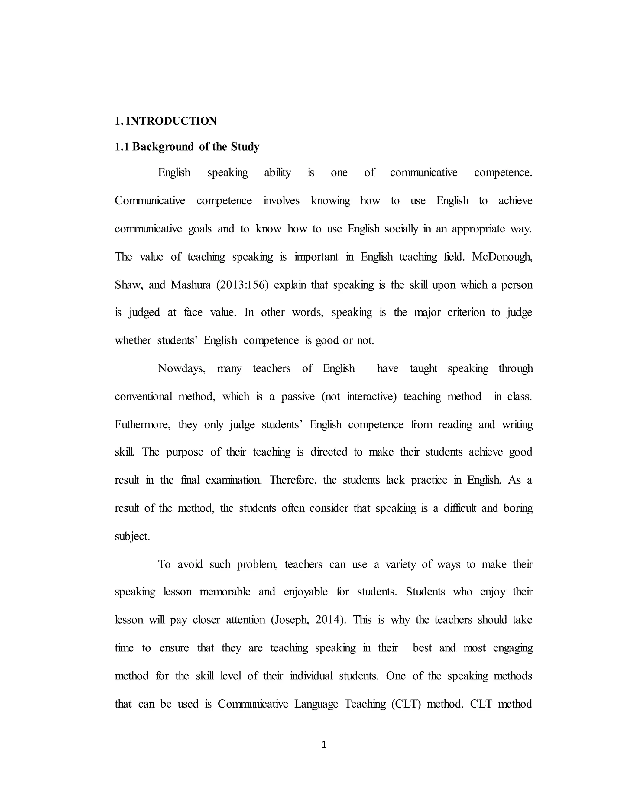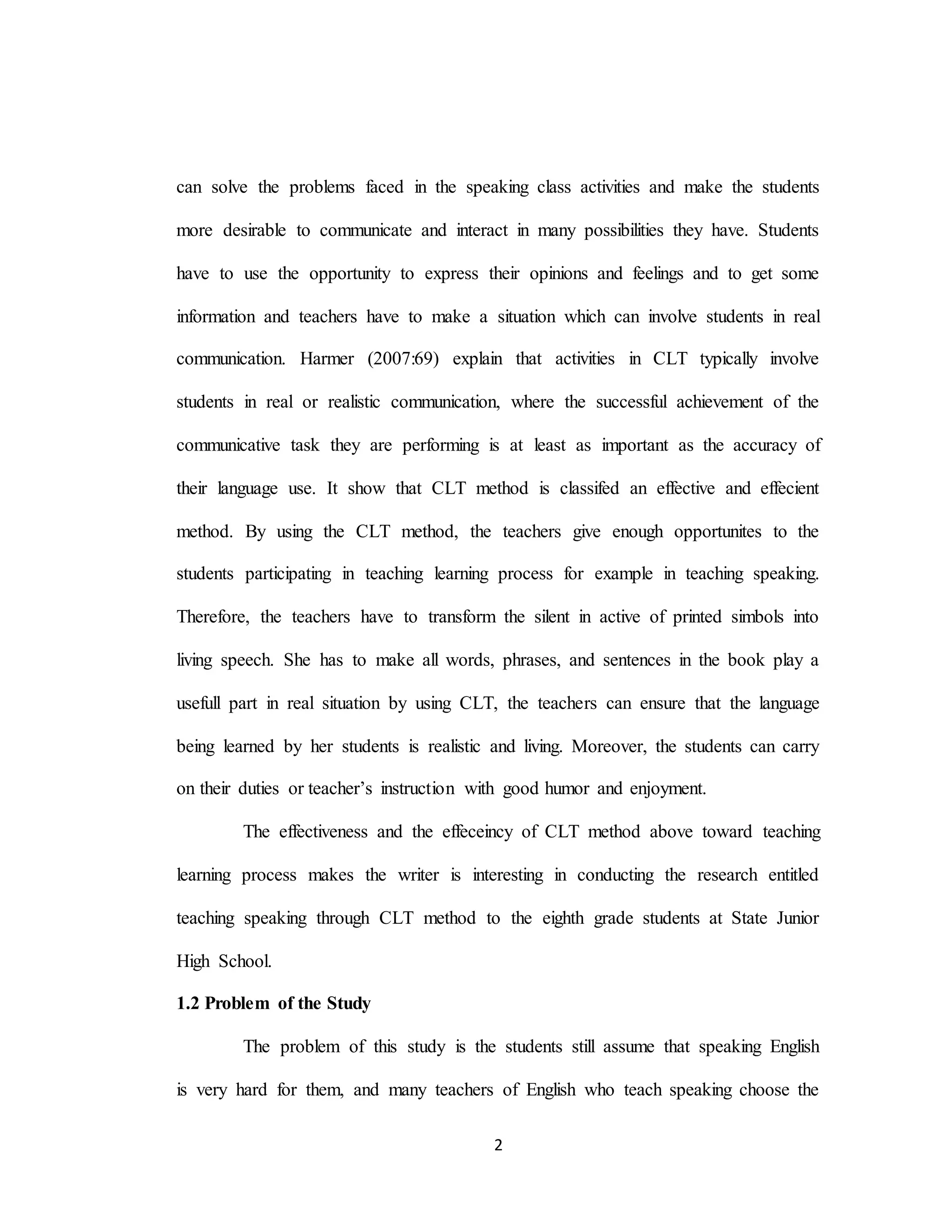 The document discusses teaching speaking skills and the Communicative Language Teaching (CLT) method. It states that traditionally, speaking skills have been undervalued and taught through passive methods, negatively impacting students' English competence and enjoyment. The CLT method aims to address these issues by creating meaningful, interactive activities to develop students' communicative abilities. Role-play is identified as an effective technique within the CLT method by allowing students to use English in realistic scenarios. The study aims to determine if using the CLT method, specifically role-play, improves the speaking skills of eighth grade students.