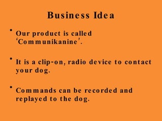 The Pet People business plan proposes a product called "Communikanine", a clip-on radio device that allows dog owners to record and replay voice commands to their dogs. The business will be a partnership between three individuals with complementary skills. Market research found that most potential customers would purchase the product from specialty pet shops or supermarkets. The plan outlines costs, pricing, promotional strategies including advertisements on buses and sponsoring animal welfare groups, and financial expectations over one and five years.