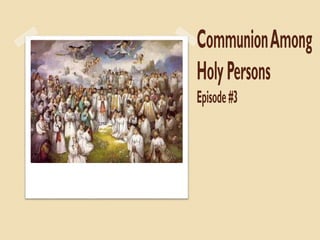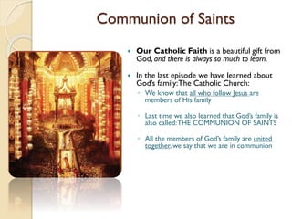 The document discusses the Catholic belief in the Communion of Saints. It explains that the Communion of Saints includes all members of God's family, whether living on earth, in purgatory, or in heaven. Those on earth are called the Church Militant and strive to become holy. Souls in purgatory are the Church Suffering and are purified before entering heaven. Saints in heaven are the Church Triumphant and are united with God. All members of the Communion of Saints are united in Christ and share in each other's sufferings, blessings, and prayers.