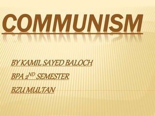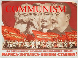 Communism aims to replace private property and profit-based economies with public ownership and communal control of major resources. There are two phases of communism according to Marx: 1) A transitional system where the working class controls government and economy but still pays people based on work. 2) A fully realized communist society without class divisions or government, where production and distribution are based on the principle "from each according to his ability, to each according to his needs." Marx argued that history progresses through stages of class struggle and revolution as technological changes alter economic conditions, and that capitalism's internal contradictions would lead to its overthrow and replacement with communism.