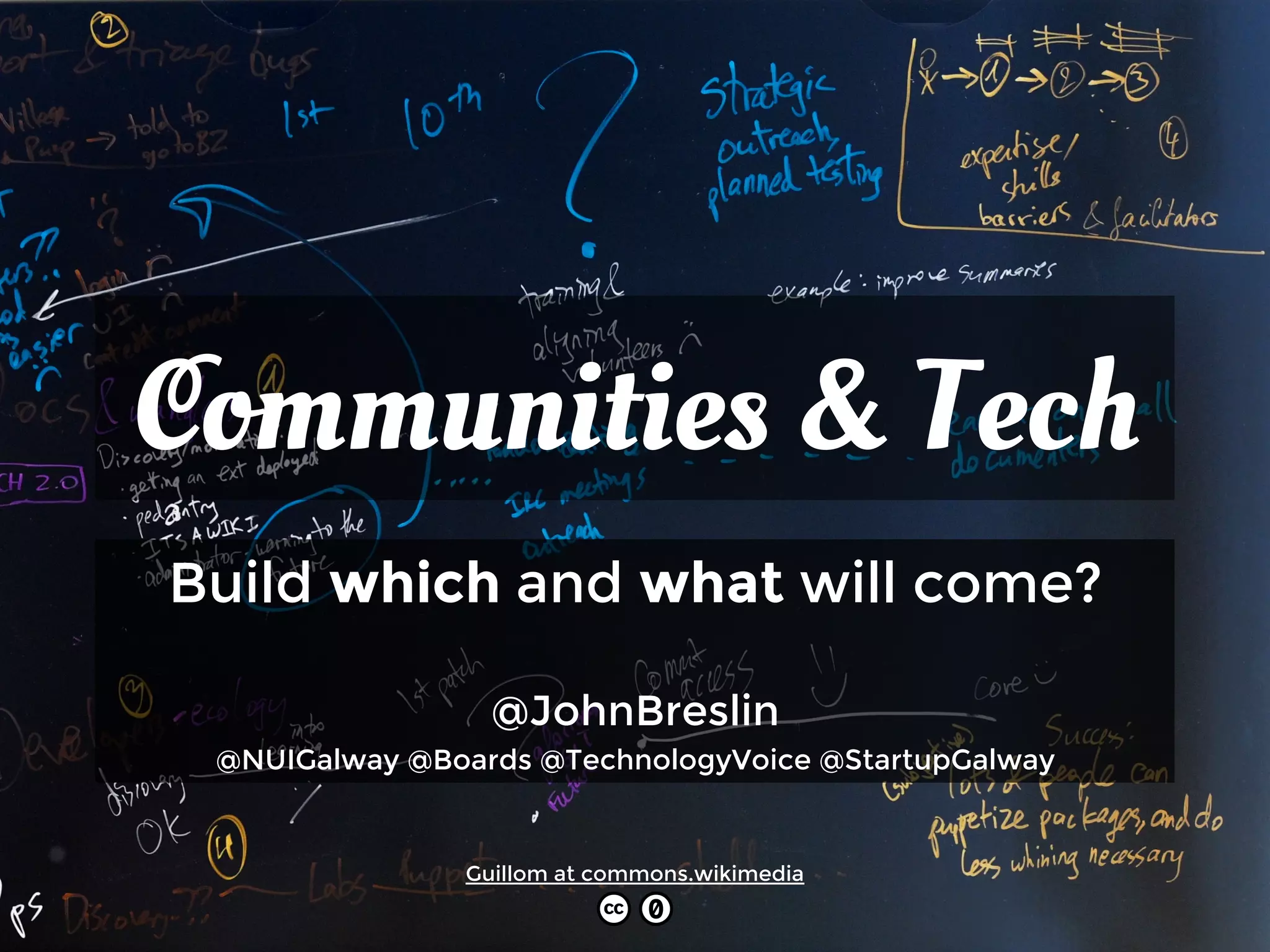 The document discusses building communities and technology. It mentions that the author's grandfather helped build a lighthouse in Clare, Ireland from 1935-1936. It also mentions the author's other grandfather who delivered letters daily by bicycle in Donegal. The author has taught over 2,500 students in 15 years as a lecturer at NUI Galway and does social media research at Insight. He also started an online gaming forum called boards.ie in 1998 that now has 2.5 million monthly users and over 2.5 billion page views. The document discusses whether to build the technology and the community will come or to build the community and the technology will come. It also mentions searching for, adopting and embracing existing groups, conversing with users