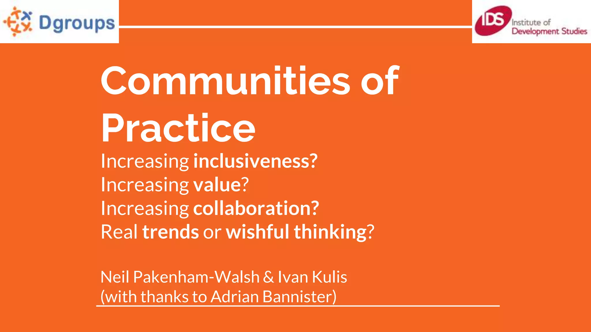 The document discusses the role and potential of communities of practice (CoPs) in enhancing inclusiveness, value, and collaboration within international development. It identifies trends such as increased connectivity and the need for psychological and technical support to overcome barriers to engagement. The conclusion emphasizes the unrealized potential of CoPs to significantly contribute to sustainable development goals if adequately supported.