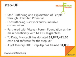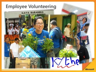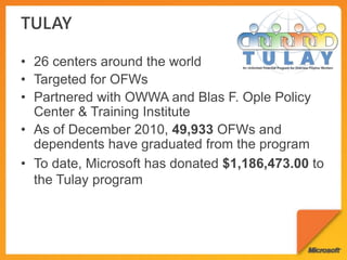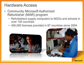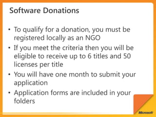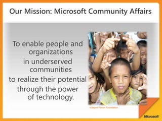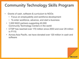 The document discusses Microsoft's Community Technology Skills Program which provides training to non-profits on using technology to transform and optimize service delivery, increase reach, and establish a stable technology foundation. The program also supports developer communities and uses technology for disaster response. It promotes tools like Office, SharePoint, and SkyDrive to enable collaboration and connectivity among non-profit groups.