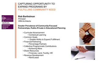 The document outlines strategies for expanding educational programs through community partnerships, emphasizing the importance of shared resources and collaboration to enhance learning outcomes and fulfill community needs. It highlights successful initiatives like joint-use libraries and organic farms that serve diverse populations while addressing education, workforce development, and sustainability. The findings stress the need for effective communication, strong leadership, and a shared sense of ownership among stakeholders to achieve lasting impact.