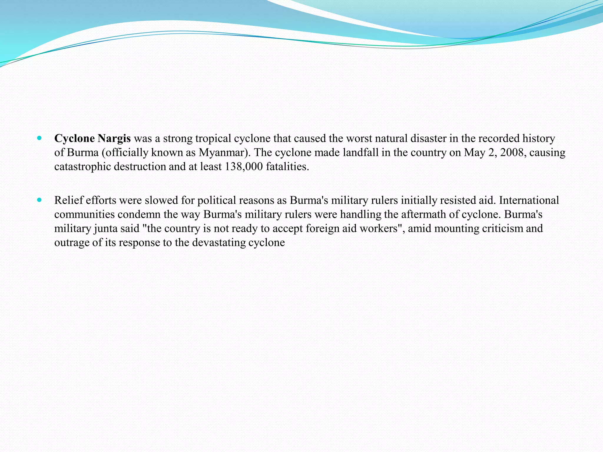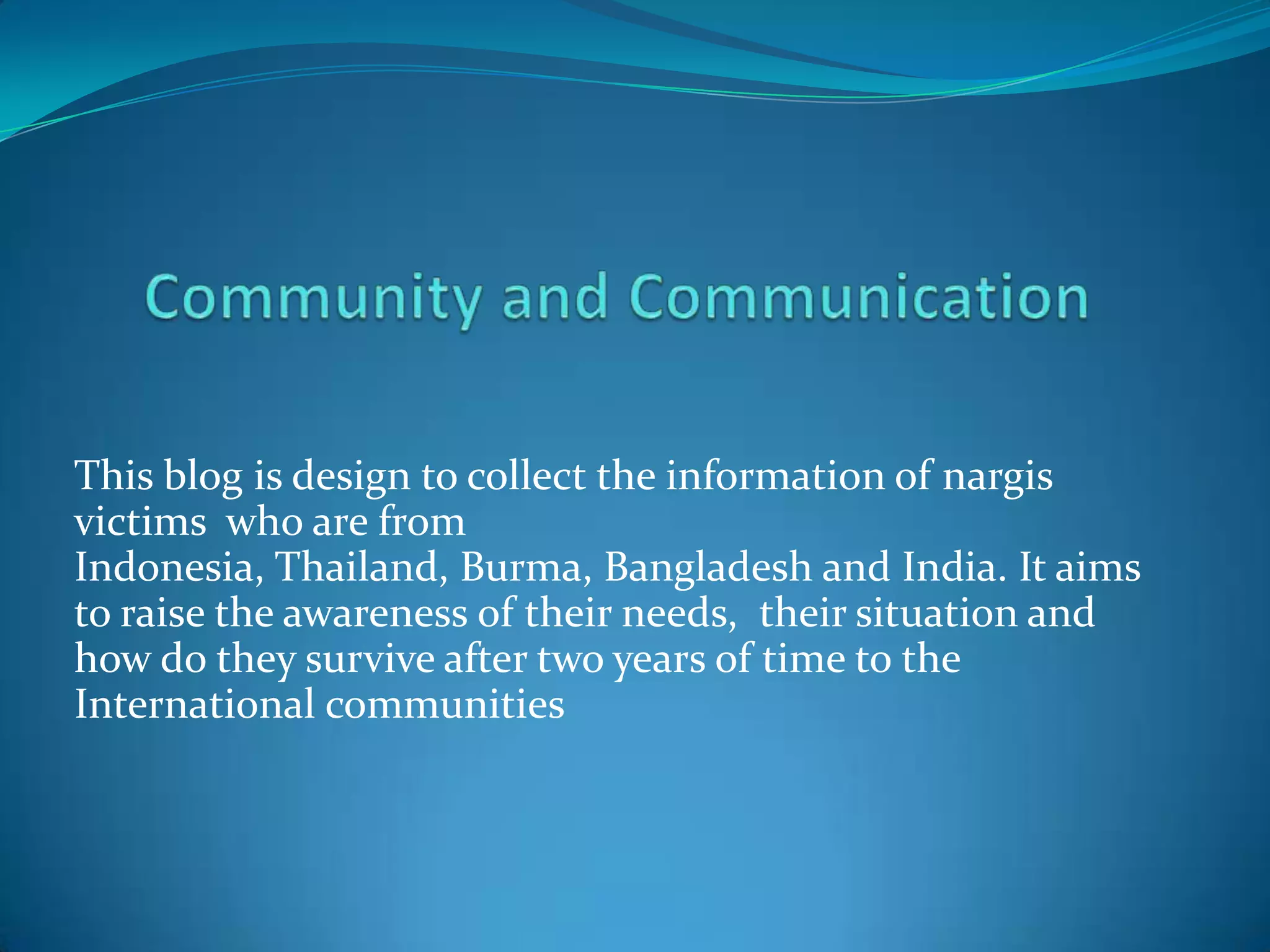This blog collects information about victims of Cyclone Nargis in Indonesia, Thailand, Burma, Bangladesh and India from 2008 to raise awareness of their needs and how they have survived in the two years since. Cyclone Nargis caused catastrophic damage and over 138,000 deaths in Burma. International aid efforts were slowed as Burma's military government resisted aid and international criticism of its response. While requesting UN help, the government remained resistant to basic assistance and delayed visas. Political tensions raised concerns that supplies could expire before aid was accepted. Foreign aid was modified to appear from the military and state media ran images of the government. Global efforts organized to call for humanitarian intervention to deliver aid. Many victims still struggle daily with