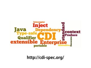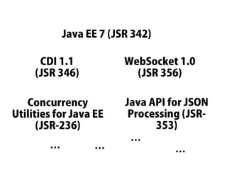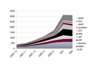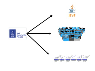 The document discusses Java EE specifications and the Java Community Process (JCP) for developing specifications. It describes the roles of expert groups and specification leads in developing specs, as well as the reference implementation, test cases, and documentation that are produced. It also provides statistics on participation in the JCP and links to resources for getting involved in the process.