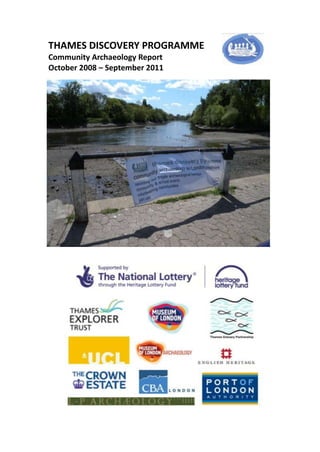The Thames Discovery Programme report covers community archaeology activities from October 2008 to September 2011, detailing fieldwork, events, and resources developed across London's intertidal zone. It outlines the project's aims, including public engagement, training, and archaeological surveys, alongside a summary of quarterly activities and achievements. The report serves as a final documentation for the Heritage Lottery Fund and includes contributions from various team members and partners involved in the program.