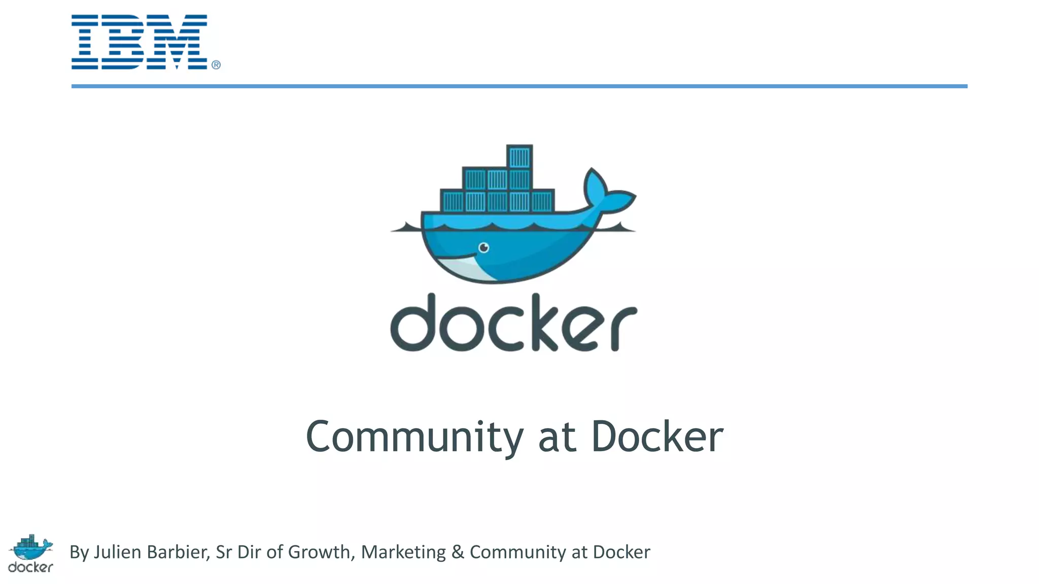 This document discusses Docker's community strategy. It emphasizes that community represents the majority of Docker's marketing efforts through word-of-mouth promotion. It stresses engaging communities both online through social networks like Twitter, Reddit, and Hacker News, and offline through local meetups. The key aspects are participating in discussions, sharing community content, identifying and engaging influencers, and helping the community grow itself by empowering local meetup organizers.