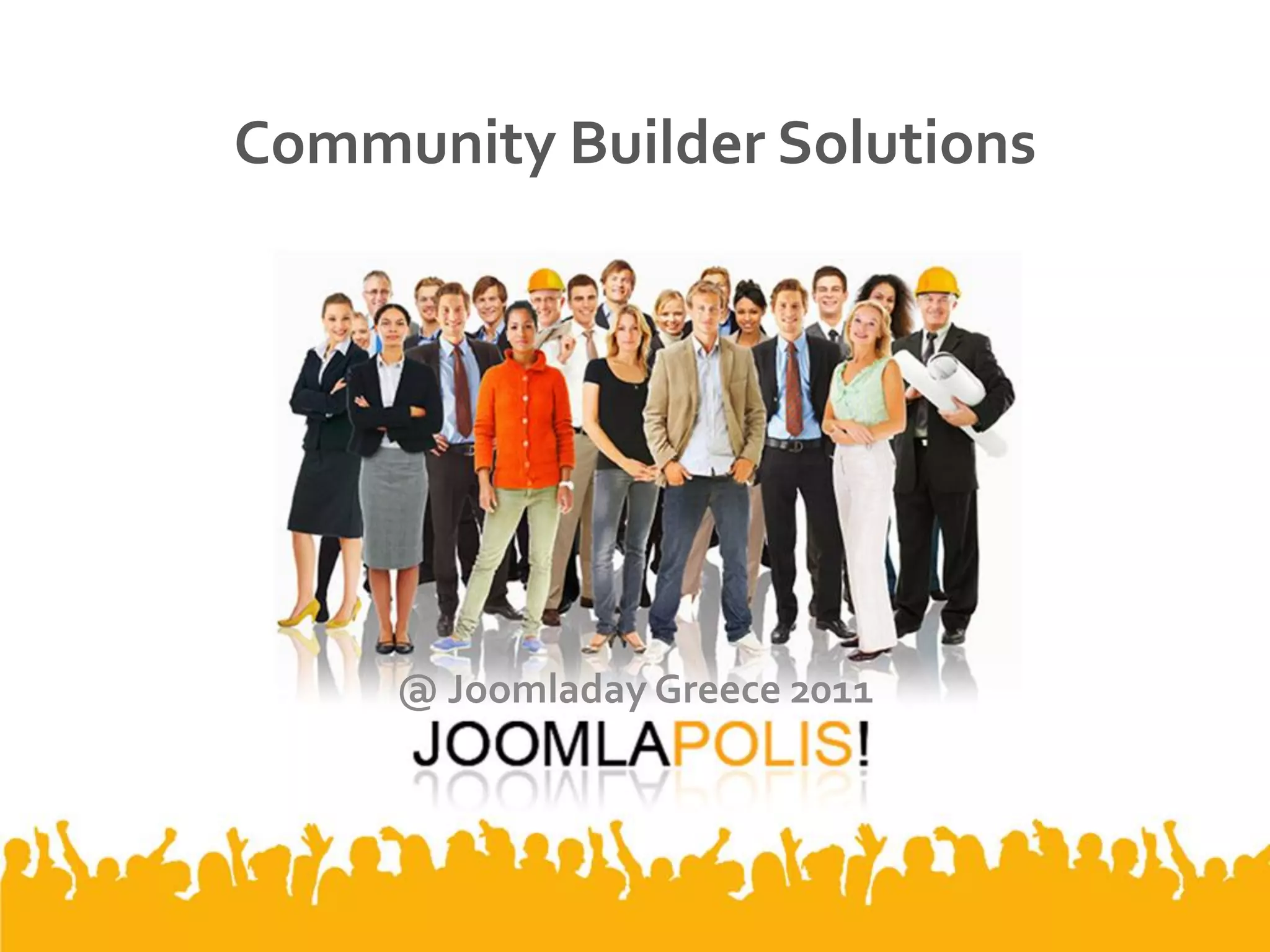 This document summarizes a presentation about Community Builder Solutions tools for community building and membership management. It includes: