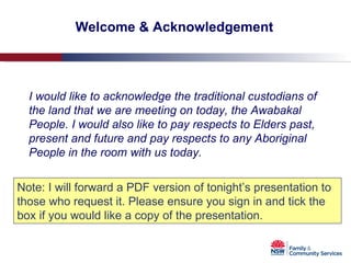 This project summary provides an overview of a funding program for community strengthening projects called Community Builders. It discusses the rationale for community strengthening, characteristics of strong communities, eligibility criteria for funding, and examples of previous funded projects. The funding program aims to build capacity, connect disadvantaged groups to the broader community, and enhance communities' ability to manage issues. Examples of funded projects include a native garden enterprise to connect Aboriginal community members and a park-based English conversation program for socially isolated CALD groups.