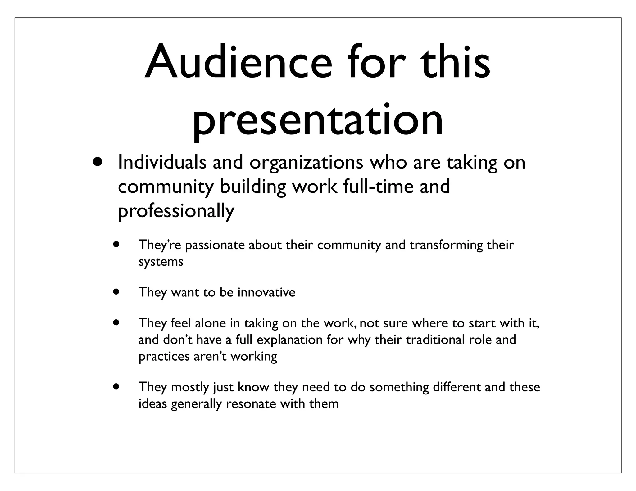 This document provides guidance for individuals and organizations looking to take on professional community building work. It begins by outlining the audience and objectives. The audience includes those passionate about transforming their community's systems who feel alone in their work. The objectives are to provide a mental model, checklist, and examples to help get started. It then delves into what professional community building entails, including strategically and authentically building communities to address social problems. Key aspects covered are understanding the current situation, reengaging the community, and fueling members to work together towards solutions.