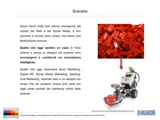 Il documento delinea una roadmap per costruire comunità di marca di successo dal 2010 al 2015, evidenziando l'importanza di creare una community centrale per l'engagement del brand. Identifica cinque tendenze emergenti, tra cui la predominanza del mobile e la convergenza multischermo, che influenzeranno il marketing online. Inoltre, propone dieci regole d'oro per costruire una community, come permettere alla community di decidere e fornire contenuti esclusivi.