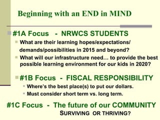 The document outlines a vision for the future of the NRWCS students and the community, focusing on infrastructure needs, fiscal responsibility, and the potential development of a community center. It presents a comprehensive analysis of current school building conditions, necessary repairs, and estimated costs while emphasizing the importance of community involvement and state aid. The proposed community center aims to offer educational, recreational, and business opportunities, thereby enriching the overall community environment.