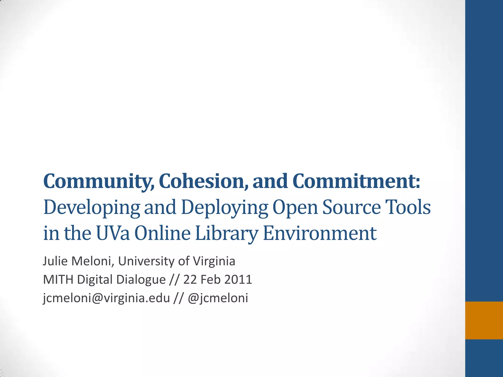The Hydra Project is a collaborative effort among several universities to develop an open-source, end-to-end digital asset management system that is flexible and extensible for various content types and interactions. It addresses the challenges of both proprietary and open-source software by emphasizing community collaboration and shared development efforts to create customizable solutions. The ultimate goal is to intertwine technical and community development threads to create a sustainable application framework supported by a vibrant user community.
