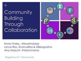 The document outlines strategies for building community through social media during the Blogalicious 2012 conference. Key points include engaging readers, providing value, using unique voices, and creating collaborative spaces online. It also highlights various community platforms and resources for fostering connections among bloggers and audiences.
