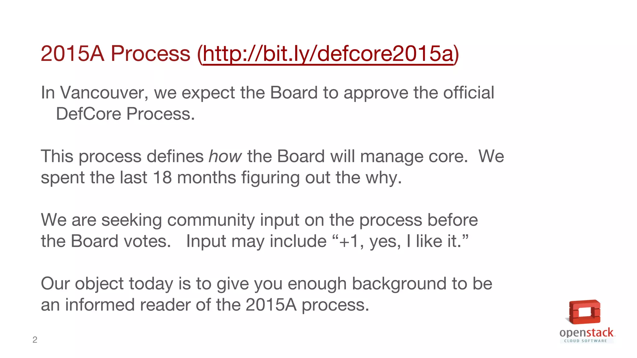 The document discusses the DefCore process, which defines the minimum standards required for products to be labeled "OpenStack". It aims to drive interoperability through common validation testing and implementation of core code sections. The process balances community and vendor input, with the community writing tests and vendors performing self-testing. It will approve guidelines every few months delineating required capabilities validated by tests as well as designated core code sections. It seeks community review of the 2015A guidelines before they are approved by the OpenStack Board to govern what functionality and code is required for OpenStack products and platforms.