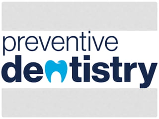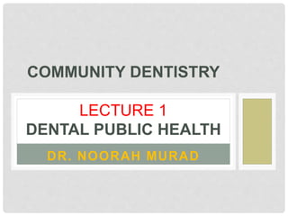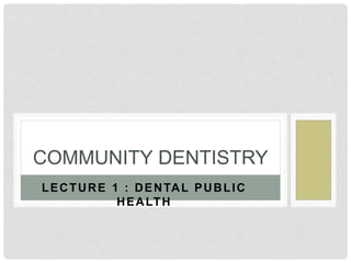 This document discusses dental public health. It defines public health as preventing disease, prolonging life, and promoting health through organized community efforts like sanitation, infection control, and education. Dental public health practitioners work to implement health policies and programs, conduct research, and promote oral health prevention and disease control. Their goals are to put policies in place, oversee research, and promote prevention. Common oral diseases include dental caries, periodontal disease, and oral cancer. Dental disease impacts public health because it is universally prevalent, does not remit without treatment, and requires technical, expensive, and time-consuming professional treatment. The tools of dental public health practitioners include epidemiology, biostatistics, social sciences, administration principles