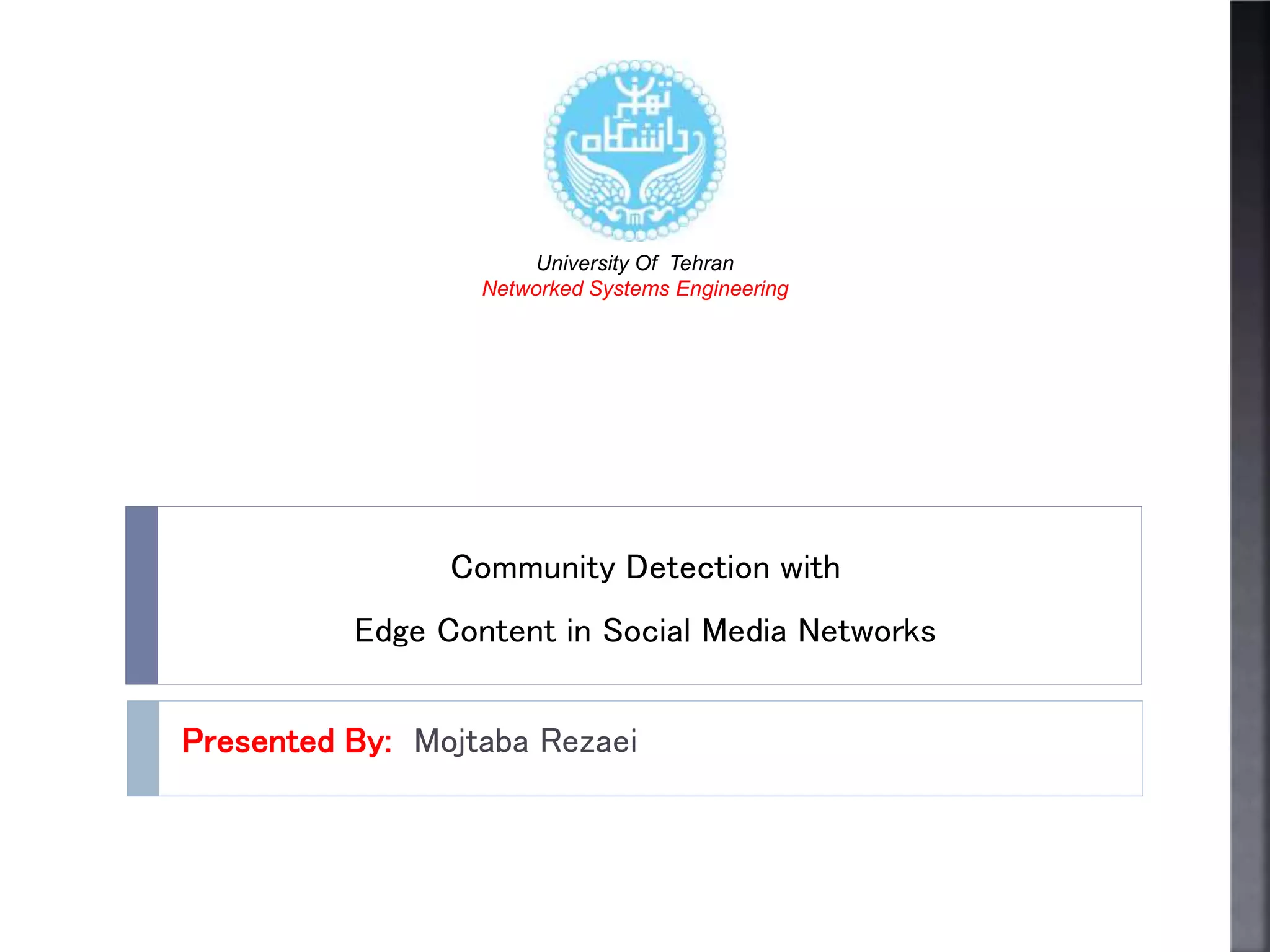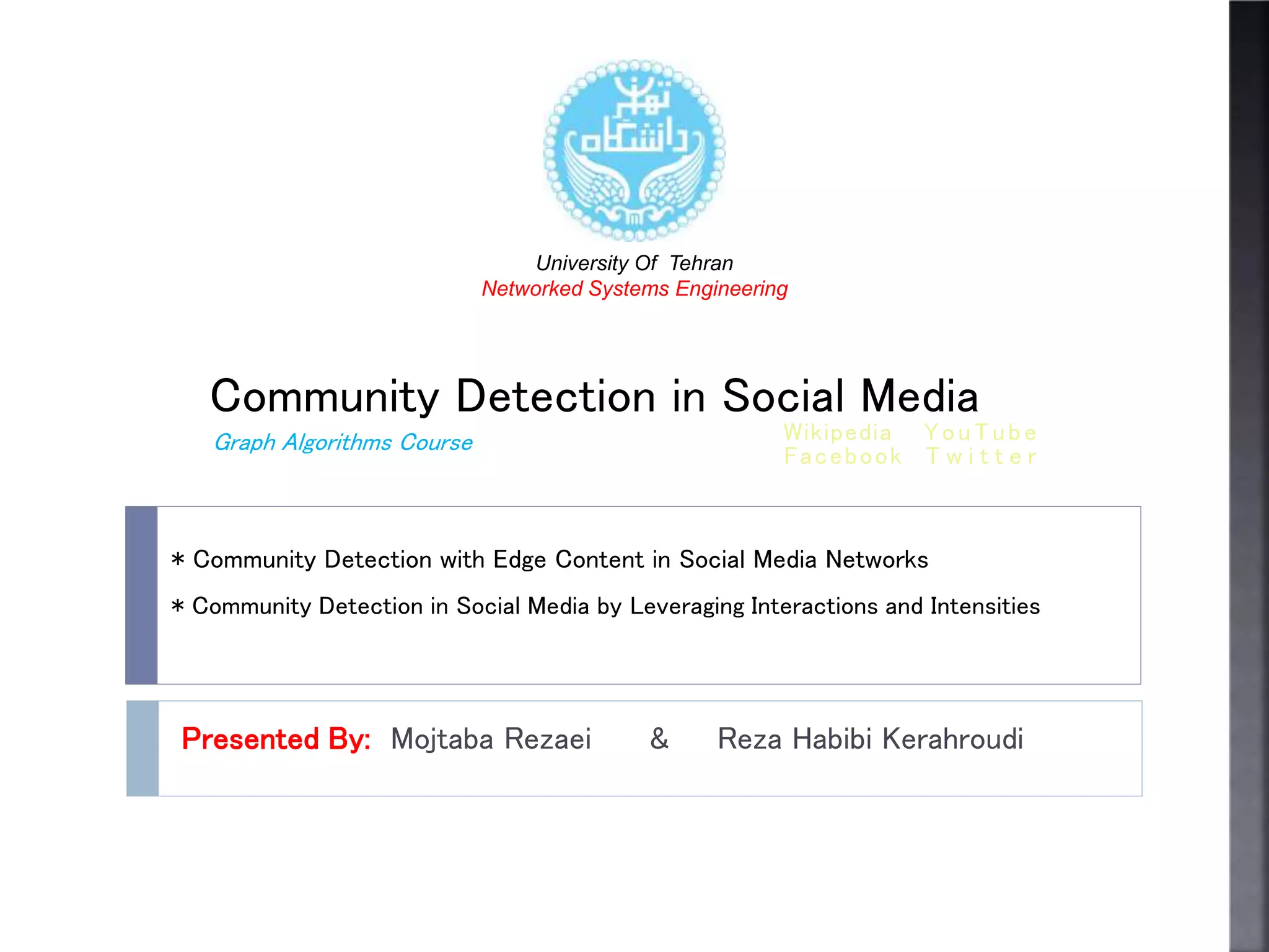 This document summarizes two presentations about community detection in social media networks. The first presentation discusses using edge content, like image tags, to help identify communities in networks. The second focuses on leveraging interaction intensities on Twitter to detect communities that form around certain events over time. Both aim to improve on traditional methods that only consider network structure.