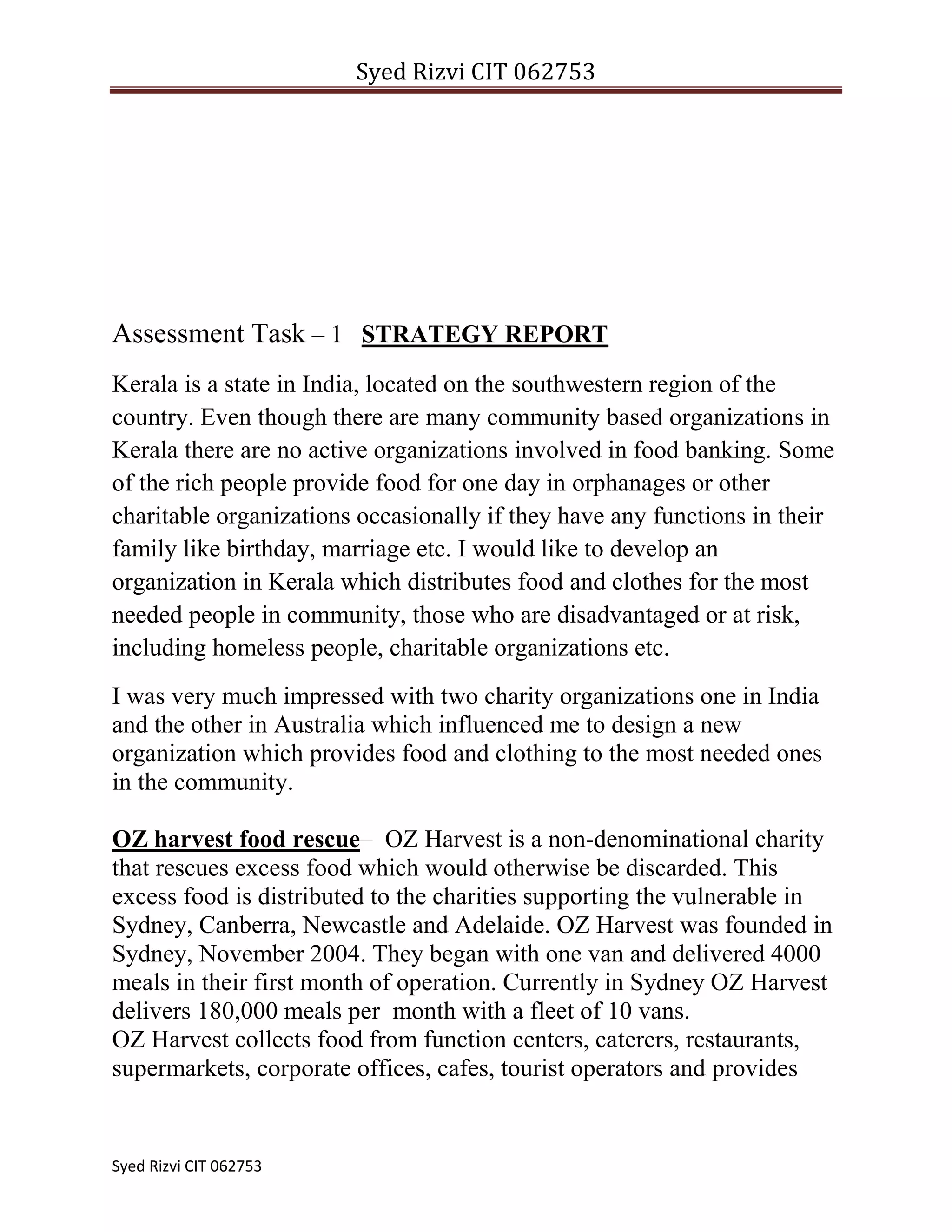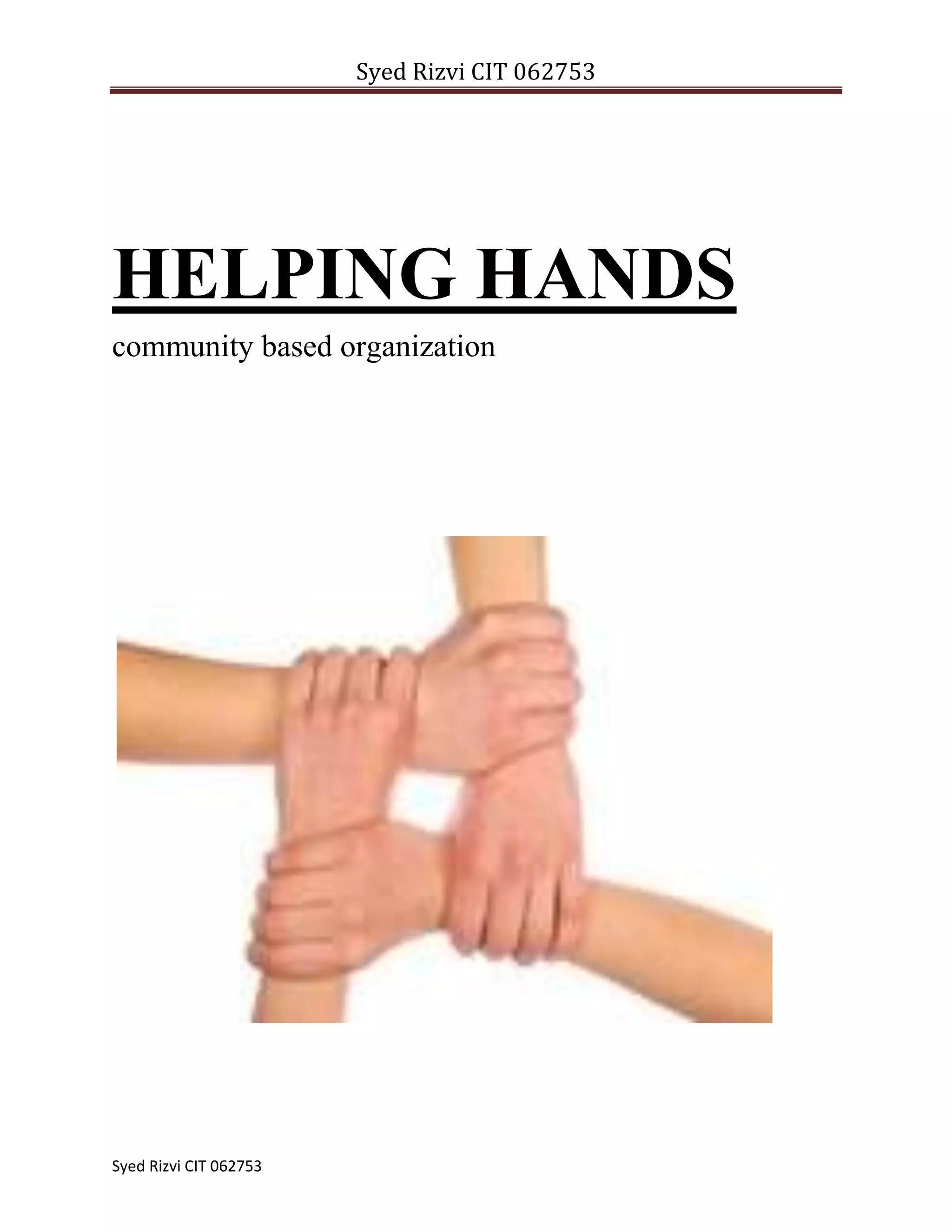 The document proposes establishing a community organization called Helping Hands in Kerala, India to distribute food and clothing to disadvantaged groups. It discusses two similar organizations - OZ Harvest in Australia and Food for Life Vrindavan in India - as models. Helping Hands would collect excess food from shops, bakeries, restaurants and distribute it along with donated clothes to homeless people, those in poverty, orphanages, hospitals and more on a daily basis to prevent food waste and help those in need. Ensuring food safety, community support, funding and leadership would be important for sustainability.