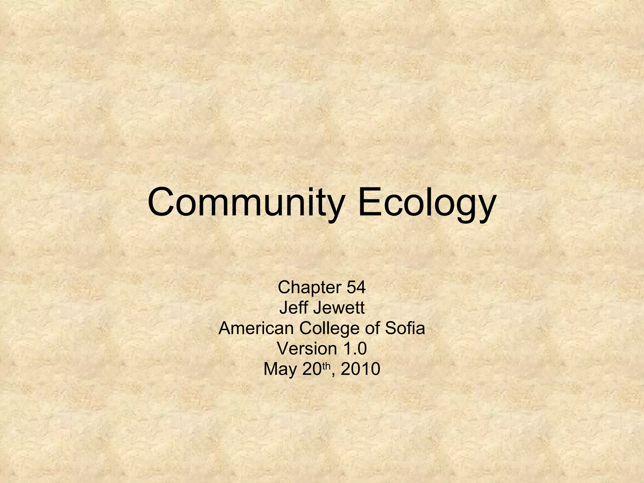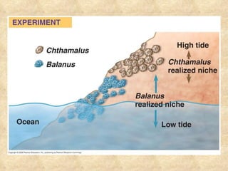 Community ecology examines the interactions between populations of different species living in the same area. Species compete for limited resources but can coexist through mechanisms like resource partitioning, where species differentiate their use of resources to reduce competition. Disturbances can alter communities, initiating primary or secondary succession as the community reestablishes itself over time. Keystone species play an outsized role in community structure and ecosystem function.