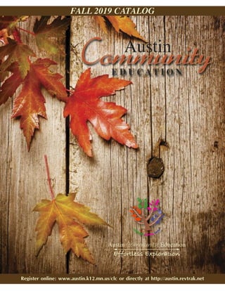 The document is a course catalog for fall 2019 classes offered by the Austin Community Learning Center. It provides information on registering for classes, lists overviews and details of classes for adults, youth, and families in areas like enrichment, health and wellness, art, and trips. The coordinator welcomes people to explore the catalog and hopes they find something of interest to make it a best fall.