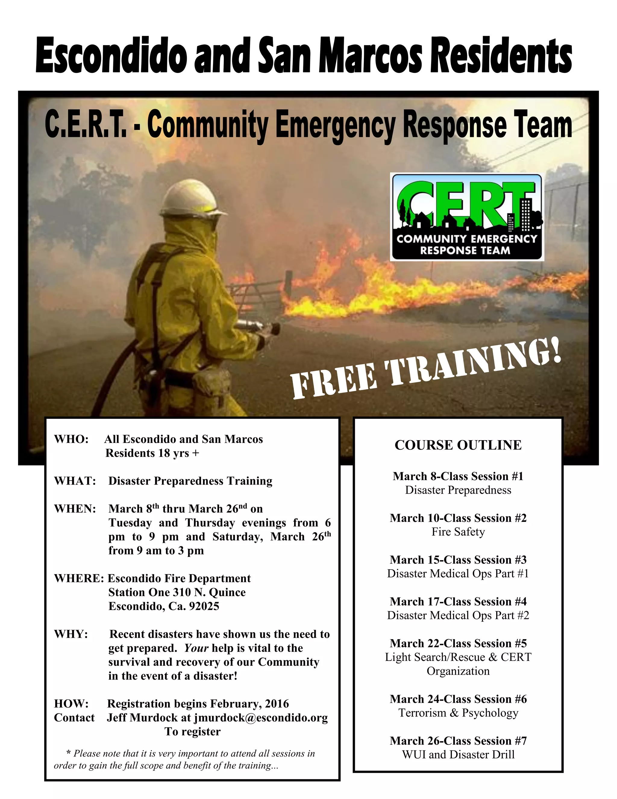 The Escondido Fire Department is offering a disaster preparedness training from March 8th to 26th for Escondido and San Marcos residents 18 years and older. The training will take place on Tuesday and Thursday evenings from 6-9 pm and on Saturday March 26th from 9 am to 3 pm at the Escondido Fire Department Station One. The training will cover topics like disaster preparedness, fire safety, disaster medical operations, search and rescue, terrorism, and wildland urban interface fires. Registration begins in February by contacting Jeff Murdock, and attending all sessions is important to gain the full benefits of the training.