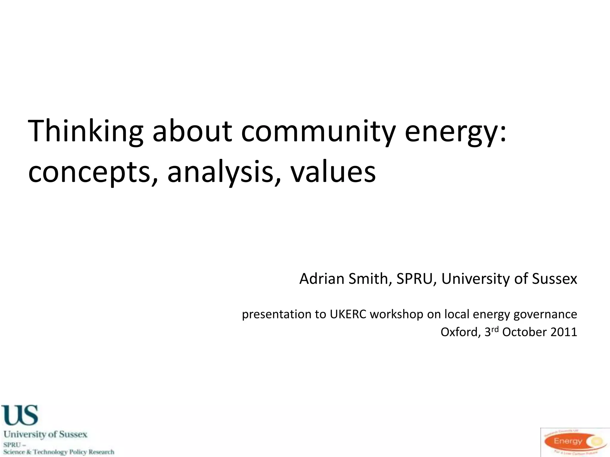 The document discusses community energy in the UK, which takes diverse forms across technologies, organizations, geography, and social groups. It involves a variety of stakeholders and has received some government support. The author analyzes community energy through different theoretical lenses like social movements, energy systems, and socio-technical transitions. Taking a plural approach helps reflect the dynamic and diverse reality of community energy initiatives.