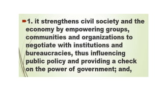 The Commission on Human Rights (CHR) is a constitutional office in the Philippines mandated to protect and promote human rights. Its mandate includes: