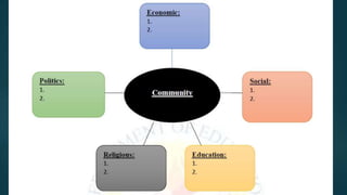 This document discusses community dynamics and community action. It defines community as a group of people who share common characteristics or interests. Communities can be geographical, based on location, or non-geographical, based on shared social attributes. Studying community is important as it encourages social cooperation, helps people improve their lives, and informs community participation policies. Community dynamics refer to changes within a community from social, cultural, or environmental factors. Community action aims to increase community understanding, engagement, and empowerment to address community issues and provide services. Key aspects of community action are raising awareness, collaborative work, and empowering communities to control their own situations.