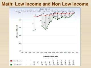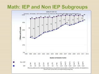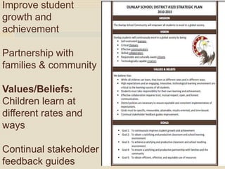 This community forum discussed Dunlap School District's focus on student growth and achievement. The district uses various assessments at the elementary, middle, and high school levels to monitor student performance and identify students who may need additional support. These include ISAT, Aimsweb, STAR, and ACT prep exams. Data is reviewed regularly by teachers and intervention programs are developed based on student needs. Stakeholder feedback from the forum will be used to further guide the district's continuous improvement efforts.