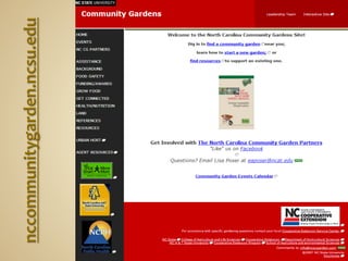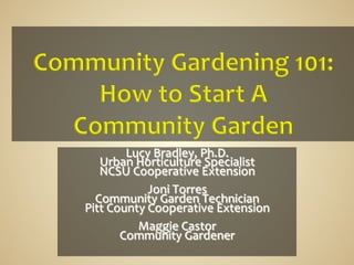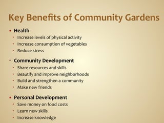 The document provides information on starting and maintaining a community garden. It discusses gathering initial support, determining garden needs, recruiting gardeners, establishing guidelines, identifying local resources, creating a garden plan, fundraising, and establishing rules for gardeners. The overall purpose is to provide guidance to community members on creating a successful and well-organized community garden.