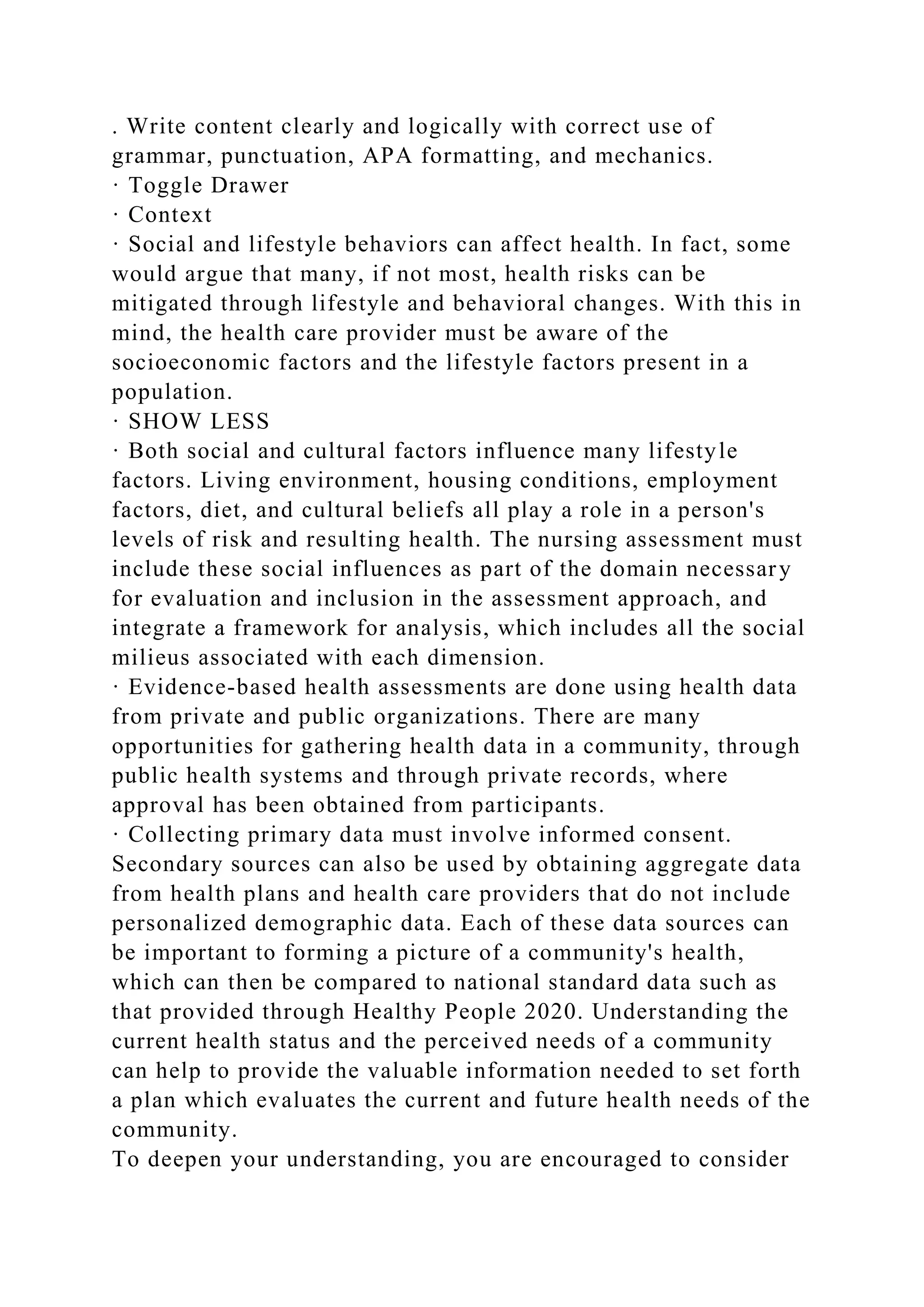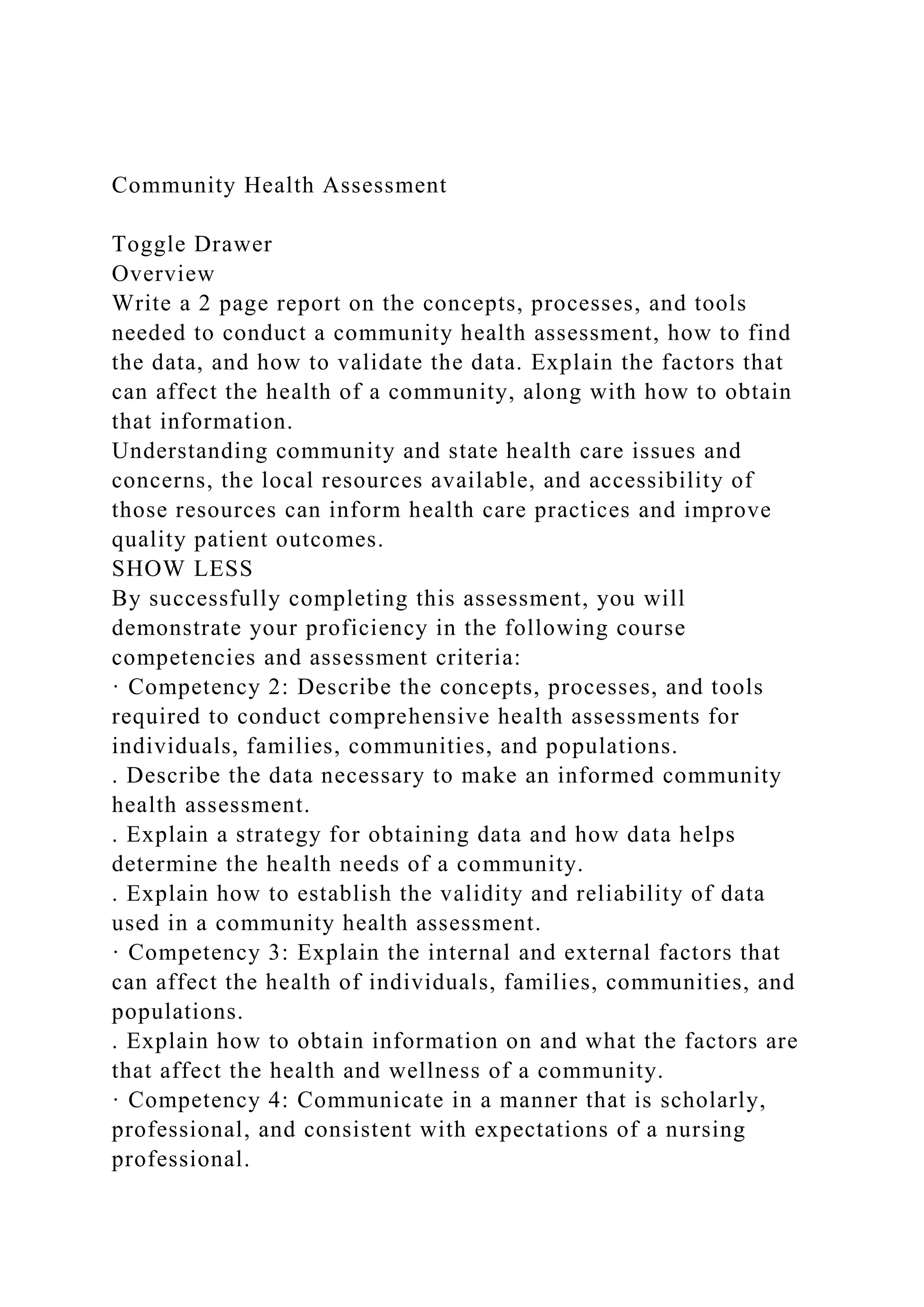 The document outlines the process and tools necessary to conduct a community health assessment, emphasizing the importance of understanding socio-economic and lifestyle factors that impact community health. It details data collection methods, including primary and secondary sources, to inform the assessment and establish validity and reliability. Additionally, it highlights the significance of effective collaboration among healthcare providers to improve patient outcomes and the quality of care.